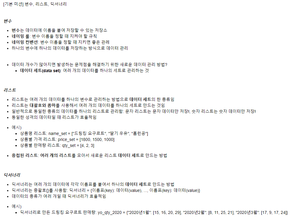 기본 미션: 변수, 리스트, 딕셔너리에 대해 이해한 내용을 본인만의 방식으로 정리한 후 포스팅하기.