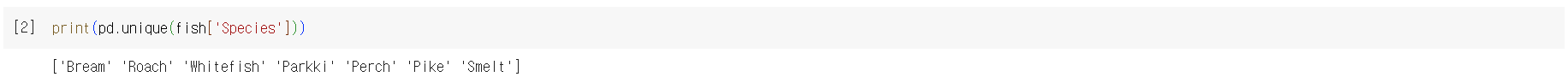 2. 타겟 데이터인 'Species' 열의 고유한 값 추출: unique() 함수 사용 - 결과적으로 생선의 종류는 총 7가지로 구성됨