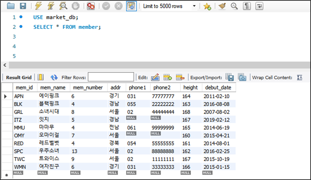 - 1. 간단한 예로 마켓 데이터베이스(market_db)안에 회원 테이블(member)만 있다고 가정하고 데이터의 입력과 삭제를 진행해보자.