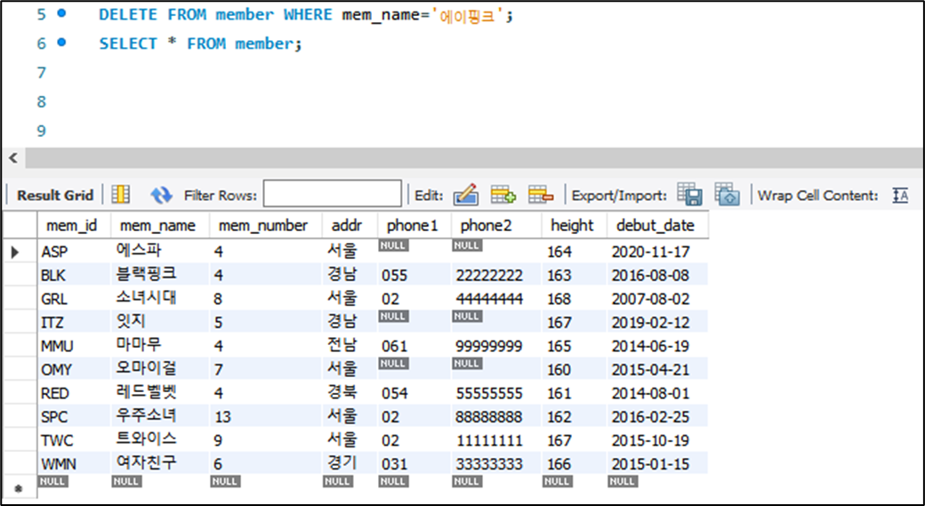 예를 들면, mem_name='에이핑크'인 데이터 삭제