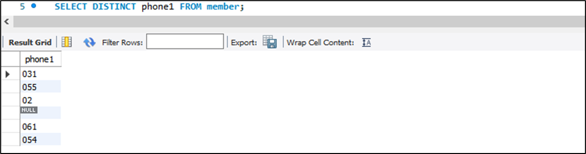 아래의 코드는 회원들의 연락처의 국번(phone1)을 중복된 데이터를 1개만 남긴 결과로 031, 055, 02, NULL, 061, 054 인 것을 확인할 수 있다.