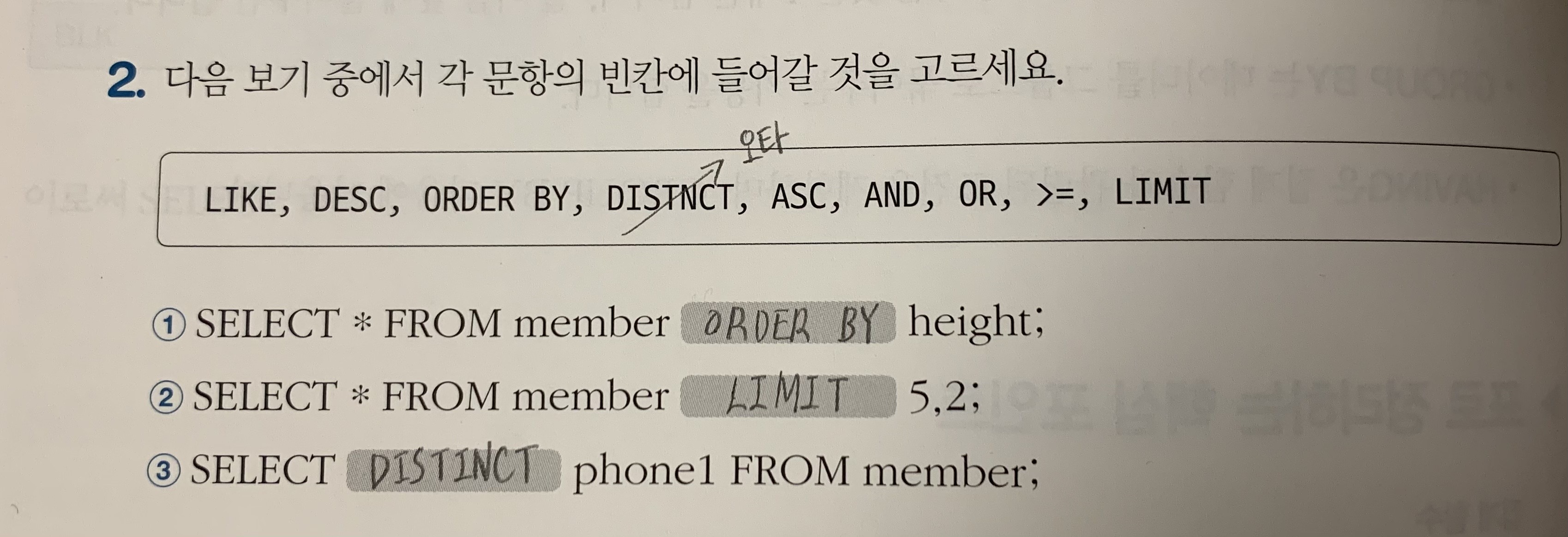 SELECT * FROM member ORDER BY height; -- 오름차순