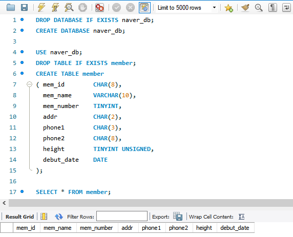 ⦁ 아래의 코드는 열 이름과 데이터 형식만 지정하여 회원 테이블을 생성한다. (PK, NOT NULL 등은 아직 지정하지 않음)
