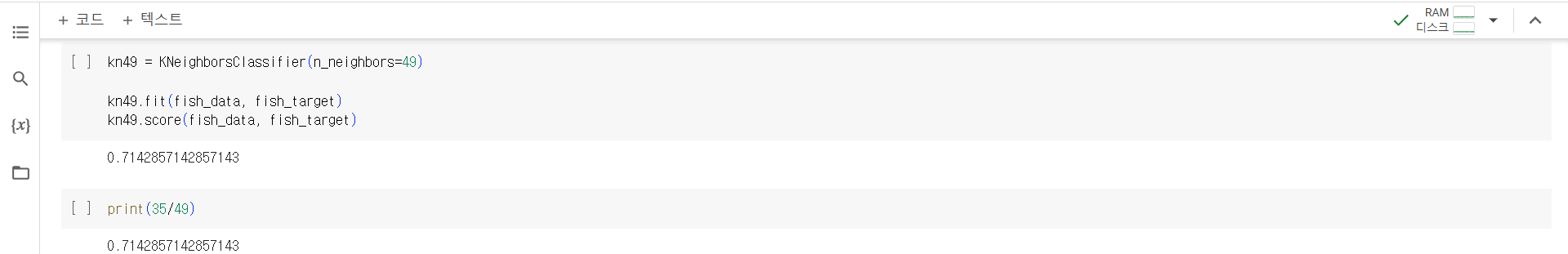 6. n_neighbors 매개변수를 기본값 5에서 49로 바꾸면 어떻게 될까요? 49개의 fish_data 데이터를 무조건 도미로 예측하게 학습이 되어 정확도가 35/49가 됩니다. 따라서 해당 데이터에서 n_neighbors를 기본값인 5로 두는 것이 좋습니다.