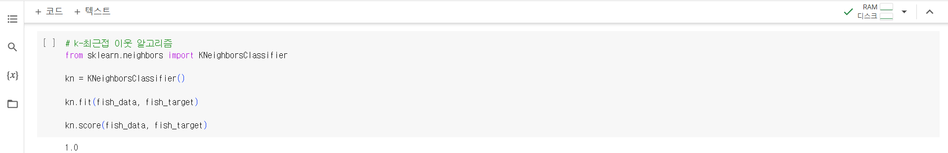 4. KNeighborsClassifier 클래스의 객체를 만들고 k-최근접 이웃 알고리즘을 구현합니다. fit() 메서드로 주어진 데이터로 알고리즘을 학습하고, score() 메서드로 모델을 평가합니다.